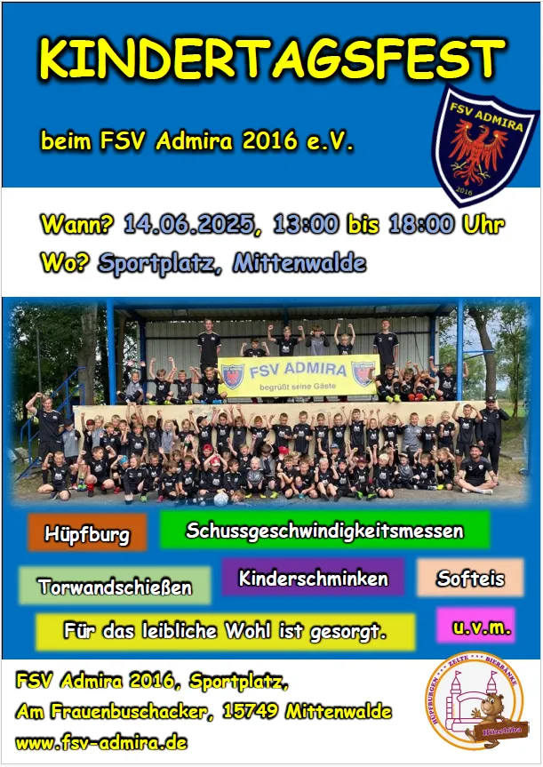 Am 14. Juni 2025 ist es wieder so weit: Der FSV Admira 2016 e.V. lädt herzlich zum großen Kindertagsfest auf den Sportplatz in Mittenwalde ein! Von 13:00 bis 18:00 Uhr erwartet euch ein buntes Programm voller Spiel, Spaß und Action: